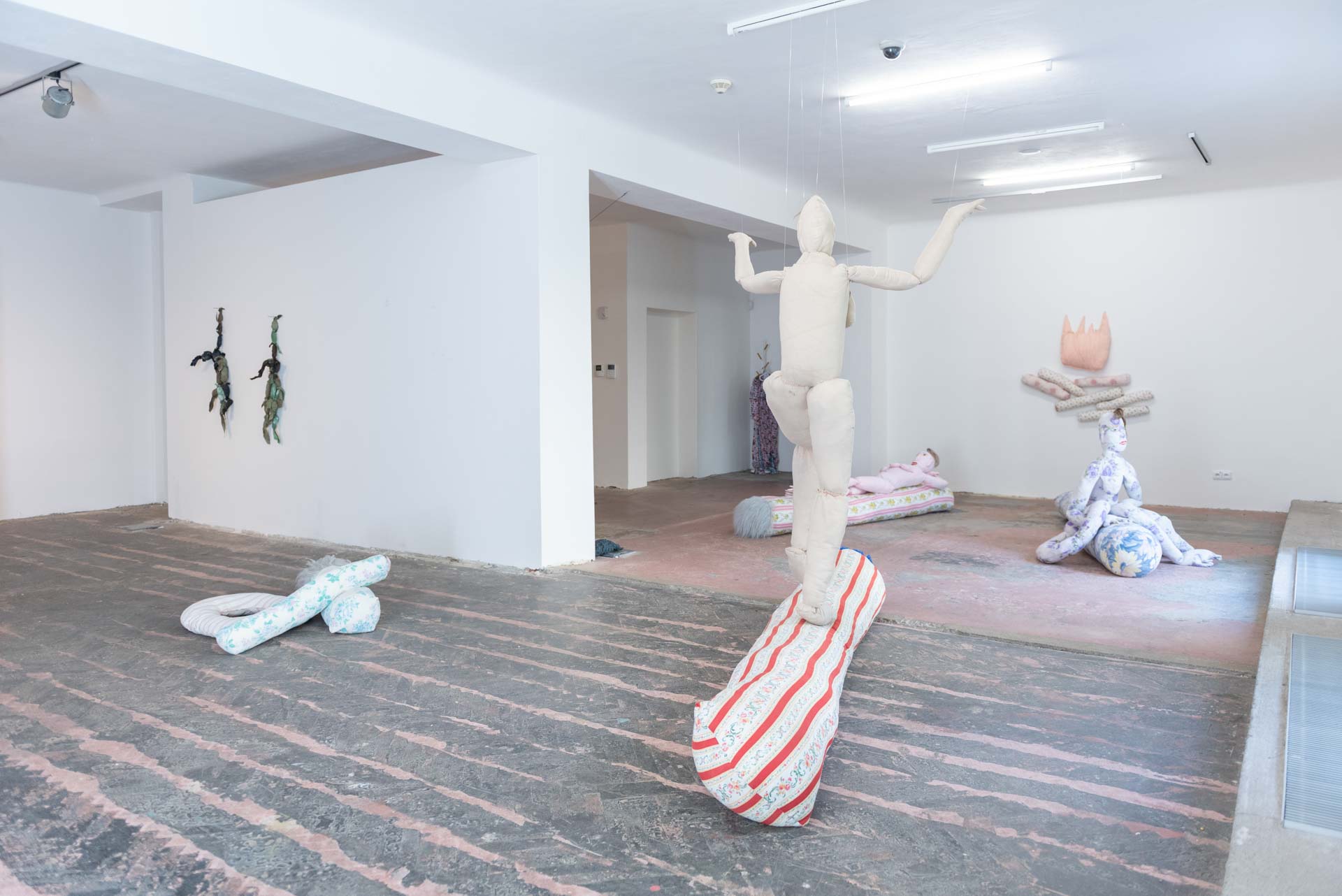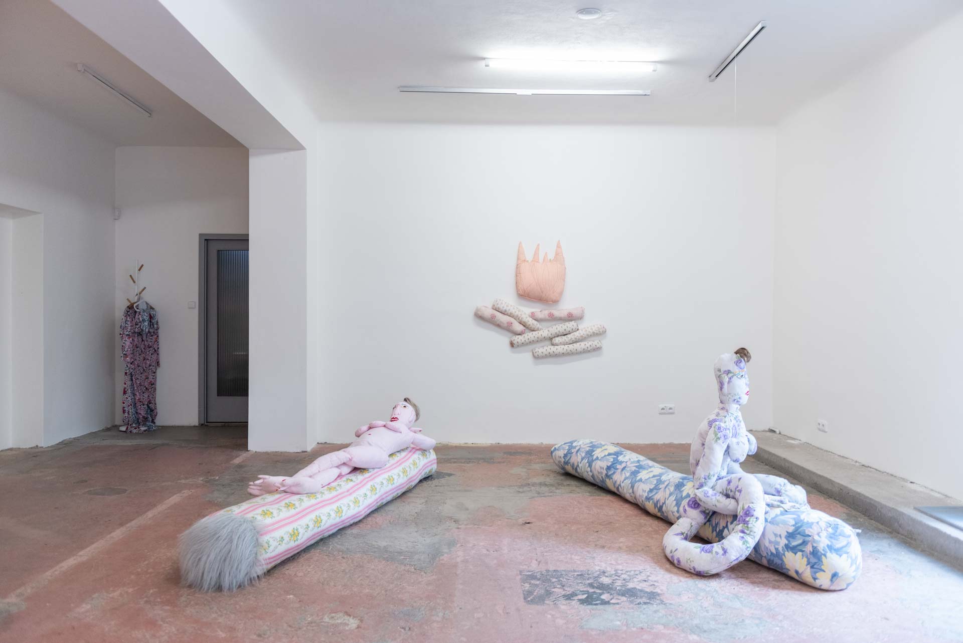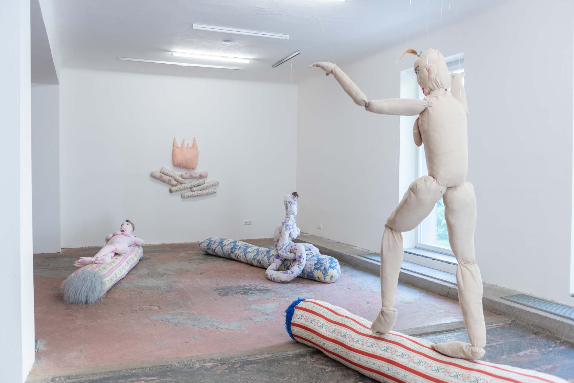 směru. Jan dlouhodobě rozvíjí poetiku textilní instalace jako prostředku pro zkoumání identity a mezilidských vztahů, jeho objekty a kostýmy často ztělesňují ambivalentní vztah k tělu – jako místu paměti i zranitelnosti. Jeho instalace přímo odkazuje na školku, která v galerii kdysi byla a ze které jsou v galerii dodnes patrné stopy. Matěj pak do instalace vnáší performativní energii, která se pohybuje mezi