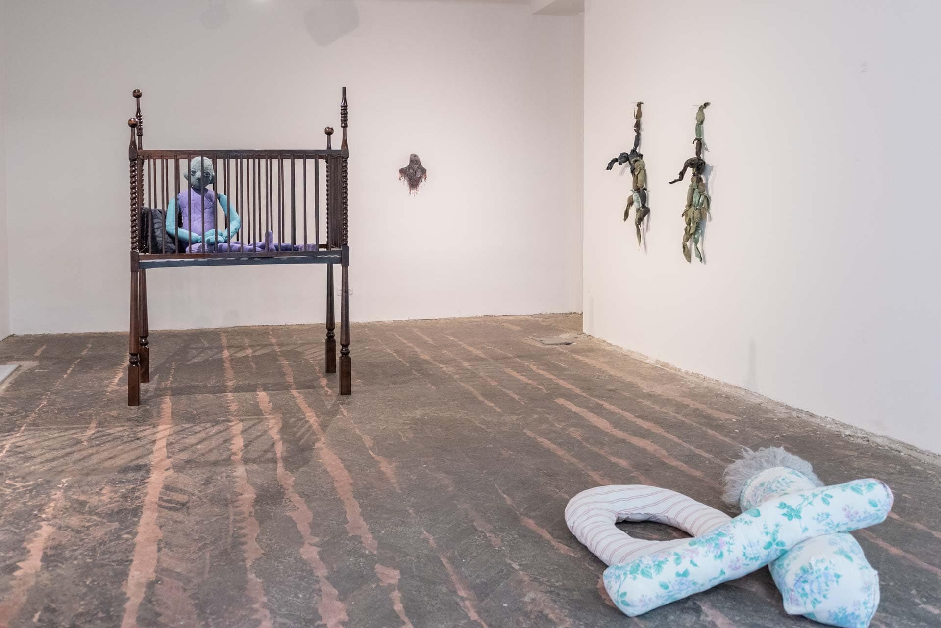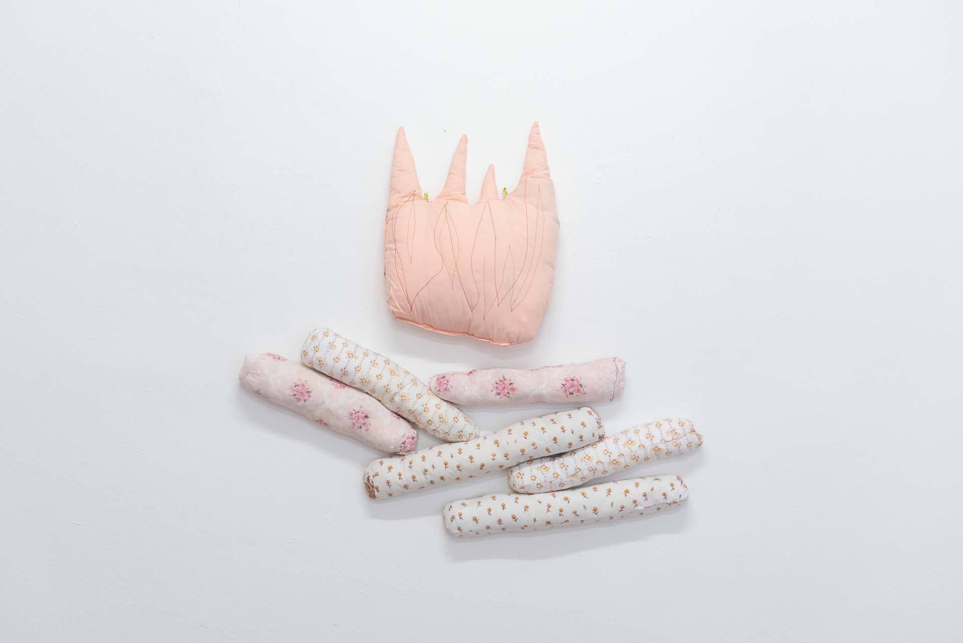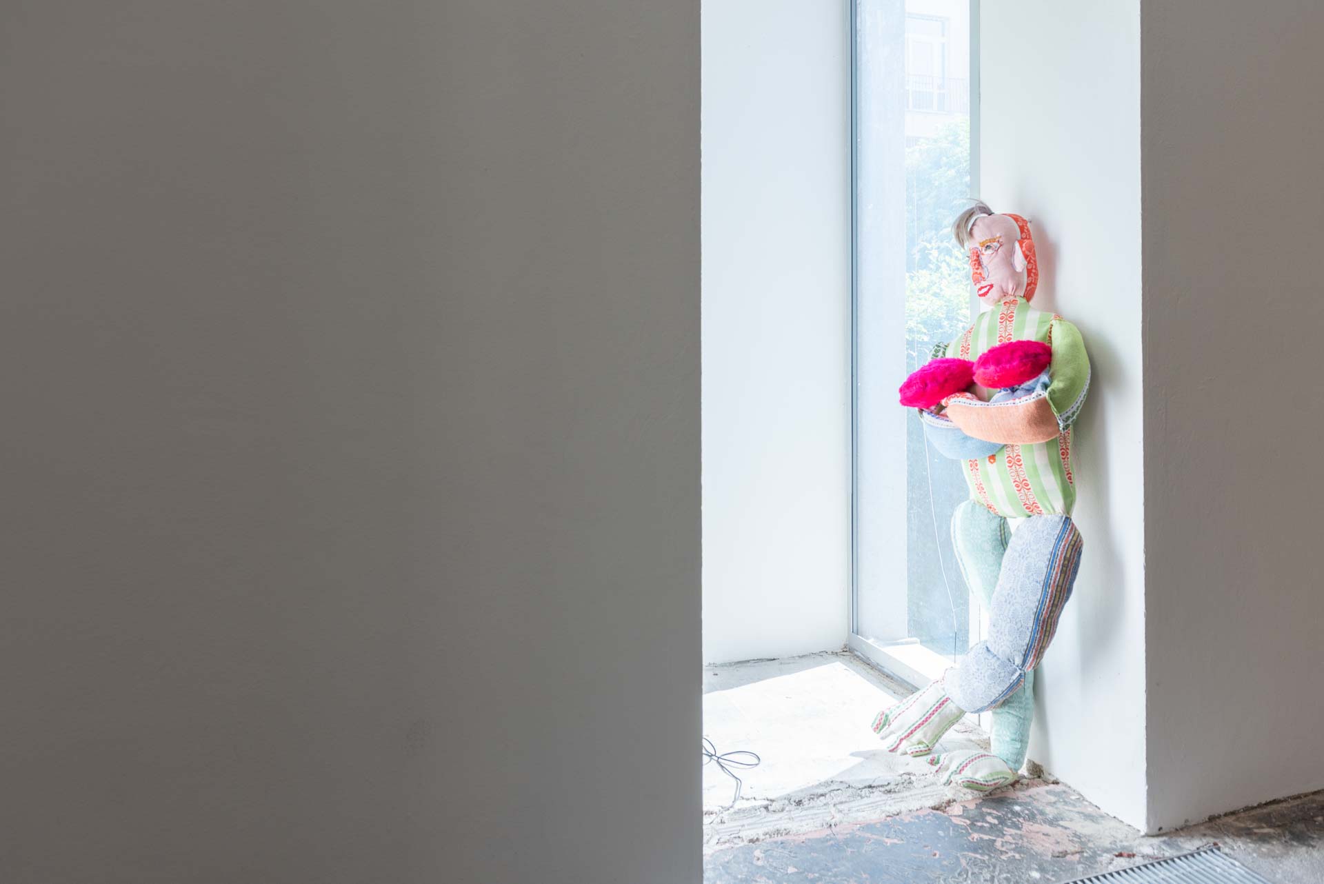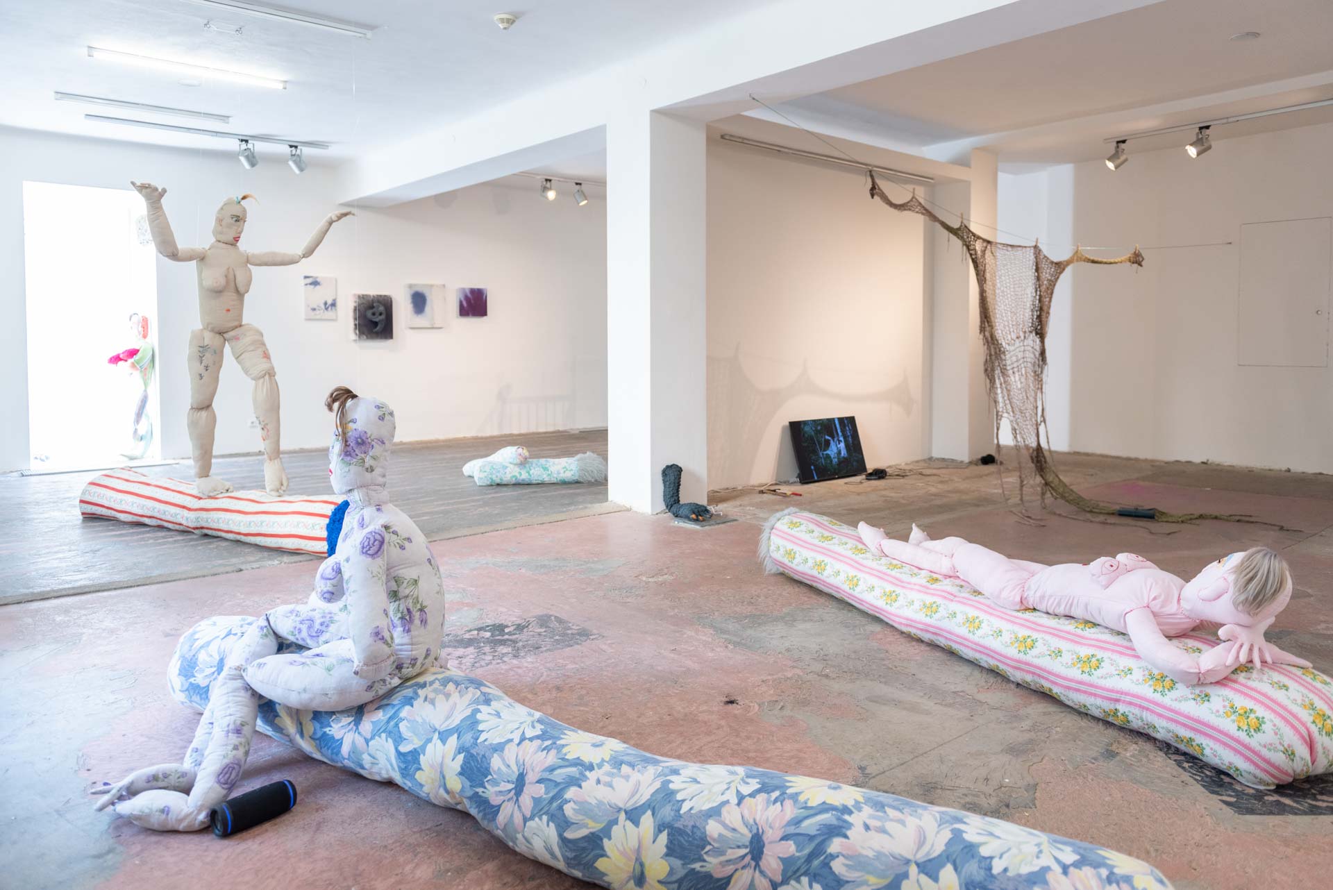 směru. Jan dlouhodobě rozvíjí poetiku textilní instalace jako prostředku pro zkoumání identity a mezilidských vztahů, jeho objekty a kostýmy často ztělesňují ambivalentní vztah k tělu – jako místu paměti i zranitelnosti. Jeho instalace přímo odkazuje na školku, která v galerii kdysi byla a ze které jsou v galerii dodnes patrné stopy. Matěj pak do instalace vnáší performativní energii, která se pohybuje mezi