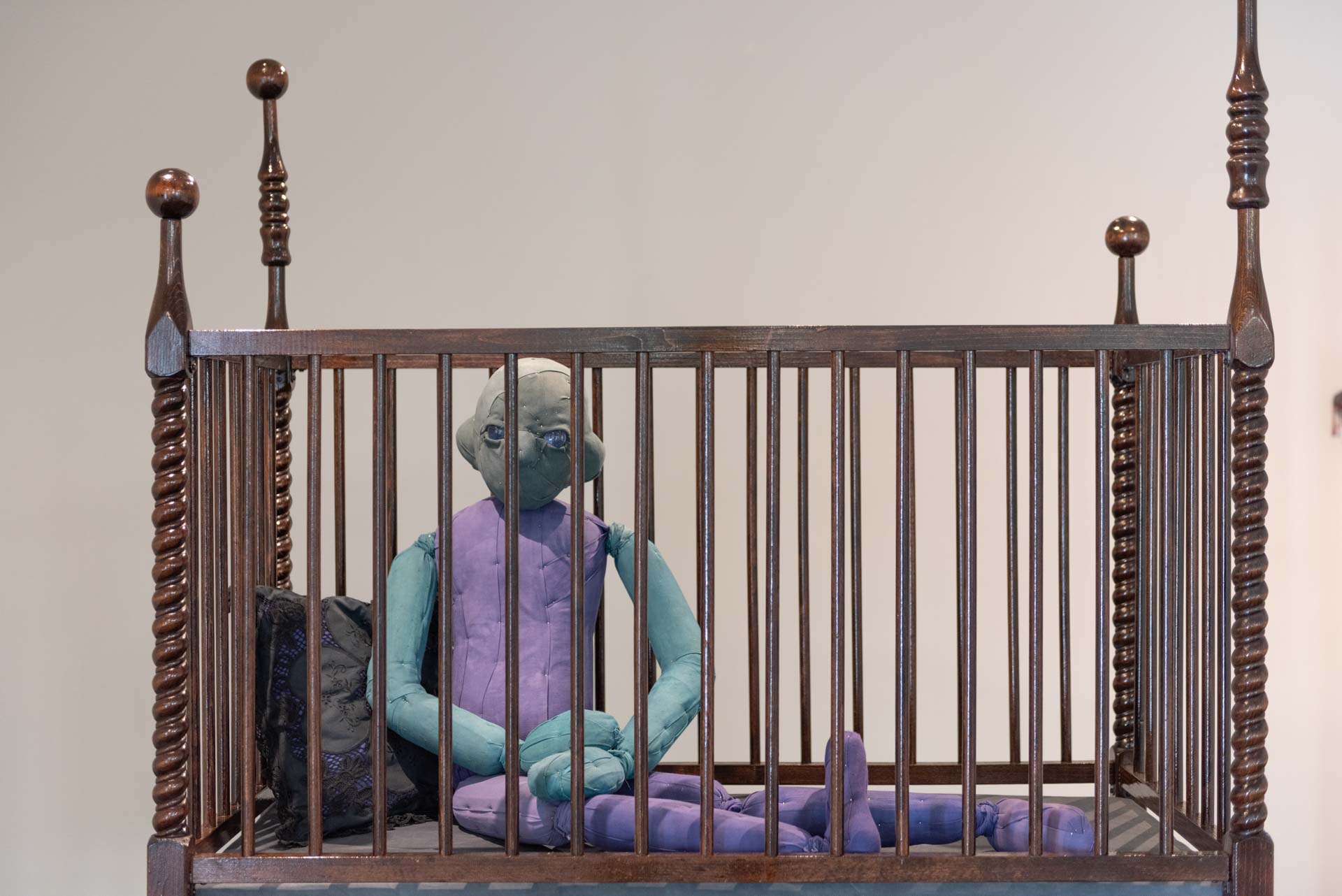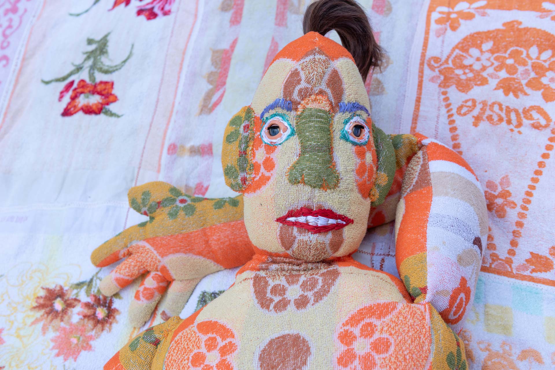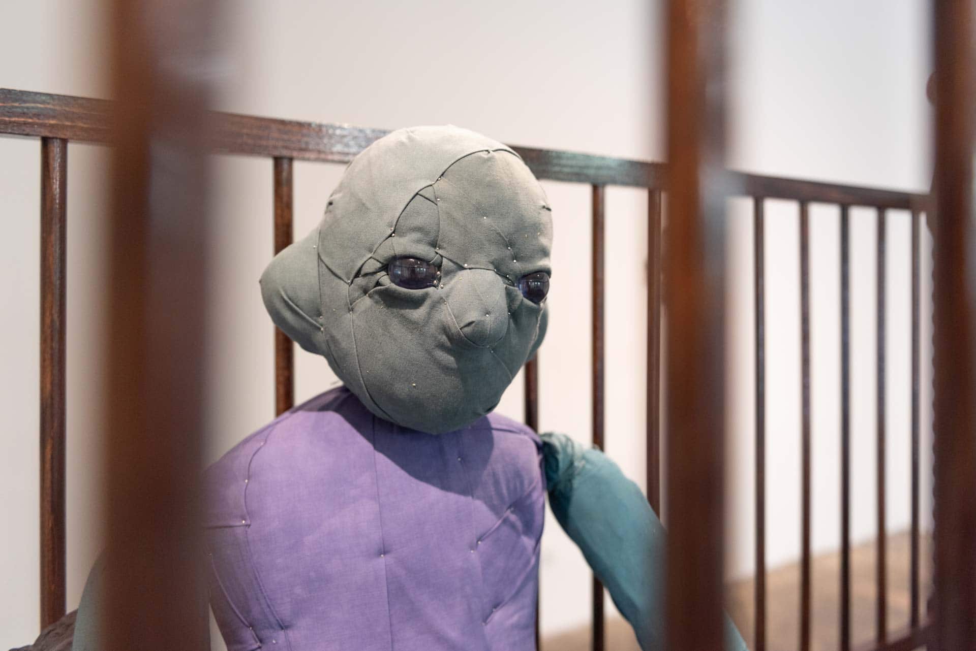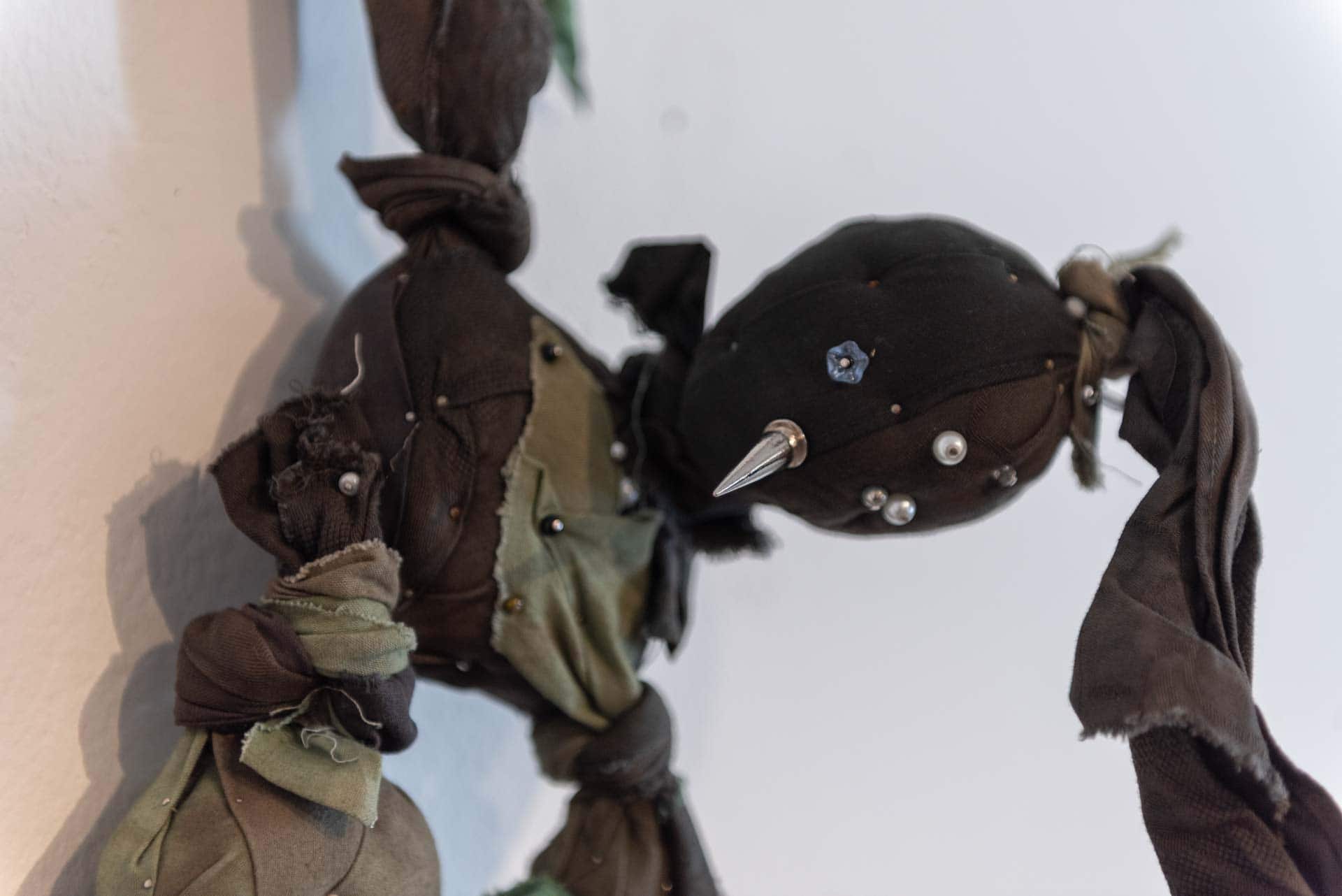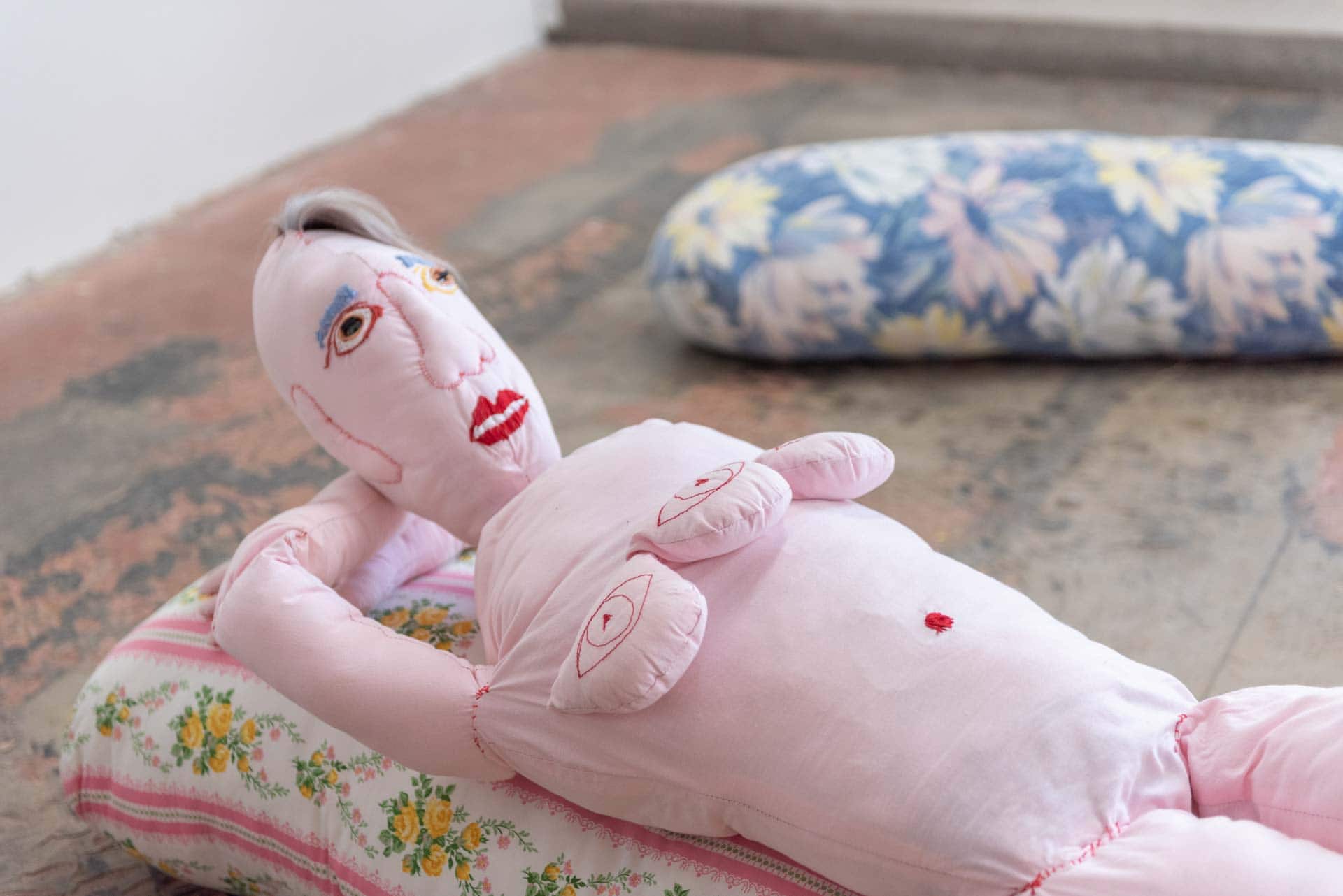 módní estetikou a terapeutickým rituálem. Skrze svou alter identitu Pchenda hledá ochranu ve formě háčkovaných textilií, kdy se jejich nošení stává emoční zbraní i prostředkem proměny. Jansová přináší do výstavy scénografickou strategii – schopnost artikulovat prostor výtvarných děl, pomocí materiálu, detailu, rytmu a smyslové zkušenosti. Skrze figuru v rozvíjejícím se konceptu Overthinking Sisters