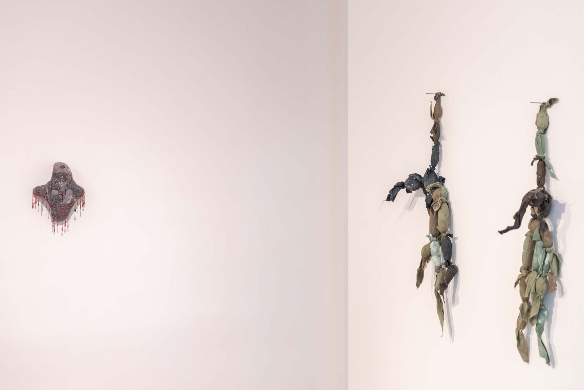 jako scénografický jazyk – struktura, která artikuluje prostor a zároveň jej dramaticky akcentuje. Výstava záměrné rozvíjí prostorové a narativní příběhy galerie OFF/FORMAT – místa s vrstvami užití a funkcí, jehož minulost bytu, tiskárny či školky rezonuje s motivem těla jako místa otisku a stopy. Trojice autoru se v rámci výstavy Ragged setkává na společném území textilu, těla a prostoru, avšak každý z jiného